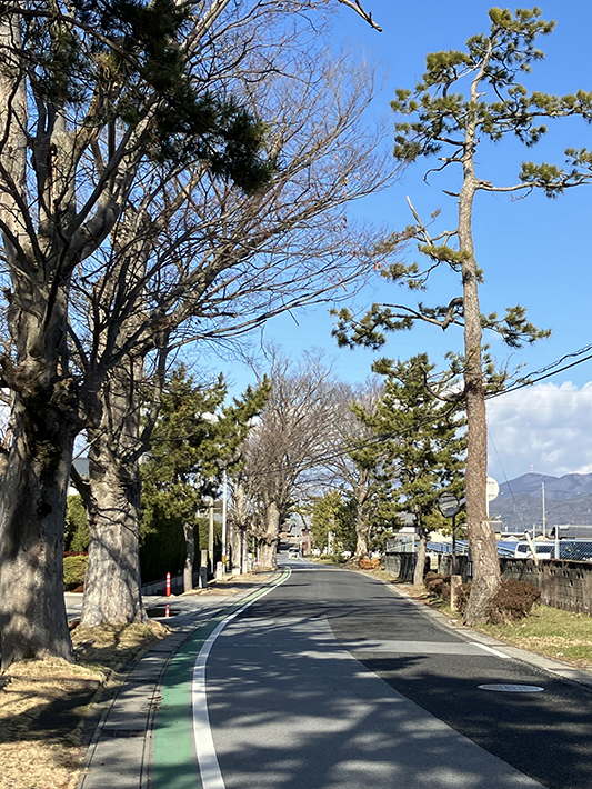 旧街道の面影は並木道にも見ることができます。道の保全のため街道の両側には松や欅を並べて並木道とすることが多く、県内では近江八景の一つに挙がる“粟津の松原”がよく知られています。しかしいまでは数本を残すのみ。それに引き換え、旧中山道が豊郷(とよさと)町と彦根市の境界を通るあたりには、立派な並木が残っています(写真2)。並木の木々は幹が太く樹齢を重ねているので、おそらく江戸時代の風景を残しているのでしょう。旧中山道は宿場町以外にも歴史の発見が多い街道なのです。