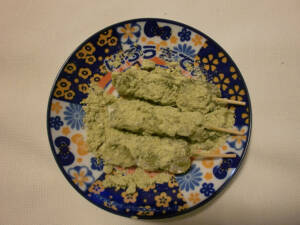 関蝉丸神社下社から、東に15分ほど歩いたところに、明治2年(1969)創業の三井寺力餅本家があります。三井寺の鐘を奪って比叡山に引きずり上げたという、弁慶の怪力にちなんで作られている、「三井寺力餅」を販売しています。「三井寺力餅」(写真3)は、近江産のもち米から作った餅を串にさし、糖蜜と青大豆の黄な粉をかけたものです。注文してから、一つ一つ作るため、できたてのお餅のふわふわとした食感が味わえます。小さめで甘すぎないので、いくらでも食べられます。3本324円で販売していて、買いやすい価格です。茶房では抹茶付きで700円で食べることができます。(価格は2022年10月調べ)