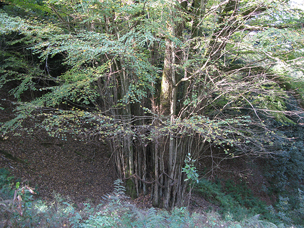 また、本堂から奥宮神社に向かう道を行くと広く開けた谷が見えてきます。この谷に沿って、驚くほど大きな桂の巨木が群生しており、この巨木群を遥拝する社も設けられています。(写真3)本尊出現の霊木だけでなく、このあたりは、日本随一※ともいわれる桂の巨木の群生地であるようです。桂の木は、谷筋や湧水地の付近など水脈のある所によく生えている植物です。雨をもたらす雷にまつわる伝承、水を好む桂の木の群生など、「水」に対する信仰がこの地を霊場たらしめている所以なのではないでしょうか。