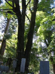 本堂の向かいに立つ桂の巨木は、ご本尊出現の霊木として信仰されています。本尊を刻んだ後の切り株から再び芽生えたといわれ、幹が二本の株立ちのようすから「夫婦桂」と呼ばれているようです。(写真1)