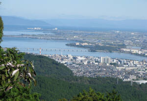 桂の巨木群生の遥拝所を離れ、上醍醐方面にむかって進むと、奥宮神社に行く分岐があり、岩間山の琵琶湖側の面に奥宮神社が鎮座しています。道中はお寺の参道のように舗装されていない自然の林道なので軽トレッキング用の靴のほうが良いでしょう。神社は昭和に出来たこじんまりした神社ですが、社殿地に上がる坂の横に琵琶湖や周辺を展望できる絶景スポットがあります。眼下に石山の町並み、京滋バイパス、少し向こうに三上山、琵琶湖方面に目をうつすと琵琶湖大橋なども見えます。(写真4)見透しが利く天候であれば、伊吹山、霊仙山なども見えるそうです。