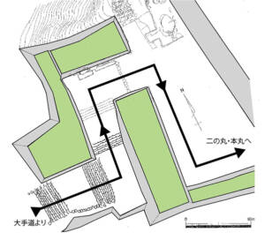 黒金門の通路は二度直角に折れ曲がってこれを通過しますが、その間は両側に堅牢な石垣が積まれています。(図1)この石垣、じつは石塁と呼ばれる幅の広い土手になっています。細長い土手(土塁)(どるい)の両側面に石垣を積んでいるので「石塁」と呼ばれます。この石塁のうえにはおそらく白壁の櫓(やぐら)が建ち、その壁には「狭間(さま)」と呼ばれる丸や三角の穴があいていたかもしれません。つまり、この門を通り過ぎる人は両側から織田軍の矢や鉄砲に狙われる仕組みになっているのです。