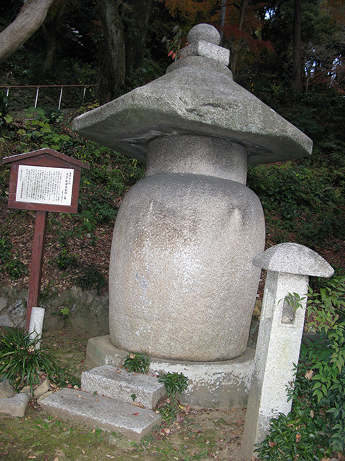 とにかく、いち押しはこの牛塔です。(写真1)石塔マニアでなくとも、そのどっしりとした造形にはなぜか惹きつけられますし、こんな急な斜面地を境内にした手狭な場所にあるのも不思議な感じです。一見の価値はあります。とくに秋はイチョウの黄葉で周囲は黄金色に彩られます。今はこの辺りは侘しい感じがしますが、古代から中世、逢坂の関を徒歩で越えていたころには道中を護る神や仏を祀る神社・仏閣がつくられ、お参りする人々でにぎわったものと思われます。