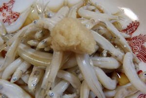浜大津方面に向かうと、このあたりは長等(ながら)商店街、菱屋町(ひしやちょう)商店街、丸屋町(まるやちょう)商店街などの大津市内でもさまざまな商店が集まっている界隈があります。湖魚の専門店も数軒あり、鮮魚から加工品まで琵琶湖の恵みに出会えます。今回取材時(3月上旬)に、長等商店街のタニムメさんを覗いてみると、氷魚(ひうお:アユの稚魚)の釜揚げがあり、迷わず買ってしまいました。氷魚は冬から早春の一時期にしか味わえない湖国ならではの美味です。(活魚の氷魚はおそらく3月半ばころまでしか出回らないでしょう。) 最近は漁獲量も減り、いつも出会えるとは限らない貴重な湖(うみ)の幸です。春はモロコ、夏はアユ、ハス、ゴリ、ビワマスなど、季節によって移り替わる湖の魚介類や冬はマガモも扱っています。
