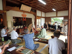 昨年(2020年)の転読は、新型コロナウイルスが世間で猛威を振るう中、行われました。多くの人が集まる転読会は「密」なので避けねばなりませんが、疫病退散を祈る法要なので、今こそ行うべき行事でもあります。結局、人数を減らし、参加者はフェイスシールドやマスクをし、部屋を開け放って行いました。もちろんアルコール消毒も(お経はムリですが)。写真2をご覧いただくとわかるように、念仏を唱えながらお経が宙を舞う、珍しい光景が繰り広げられます。この時だけ、大般若経は「文化財」から、村の人々の暮らしを守る役割を果たすアイテムに戻るのです。