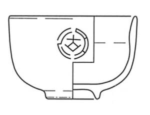ご紹介したいのは湯呑です(図1)。この湯呑は、今も使用されているような小型の白磁の湯呑です。器の外側に赤い釉薬で「湖」を記号化したマークがプリントされていました。このマークを調べたところ、琵琶湖汽船の社章であることがわかりました。つまり、琵琶湖汽船の観光船で使われていた湯呑であると考えられます。琵琶湖汽船は、竹生島めぐりや琵琶湖一周、南湖観光など琵琶湖の各地に観光船を就航させている会社です。ただし、現在は多景島への就航はありません。