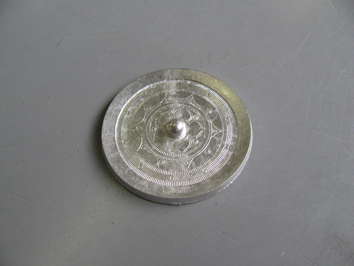 当協会の鏡作り体験で使用している鋳型は耐熱シリコン製の市販品です(写真1)。東近江市の雪野山古墳から出土した古墳時代前期の内行花文鏡(ないこうかもんきょう)をモデルにしています(写真2)。