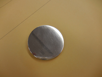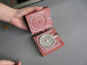 この鋳型で鏡を作るには、①溶けた金属が付着するのを防ぐため、鋳型にベビーパウダーをはたく、②鍋で溶かした低融点合金(約130度で溶ける:鉛60%・ビスマス40%の合金)をこの鋳型に流し込み、5分程たった後に鋳型をはずす、③不要部分をペンチで切り落とす、④鏡面をサンドペーパーと研磨剤で20分ほど磨いて仕上げる、という4つの作業を行います。