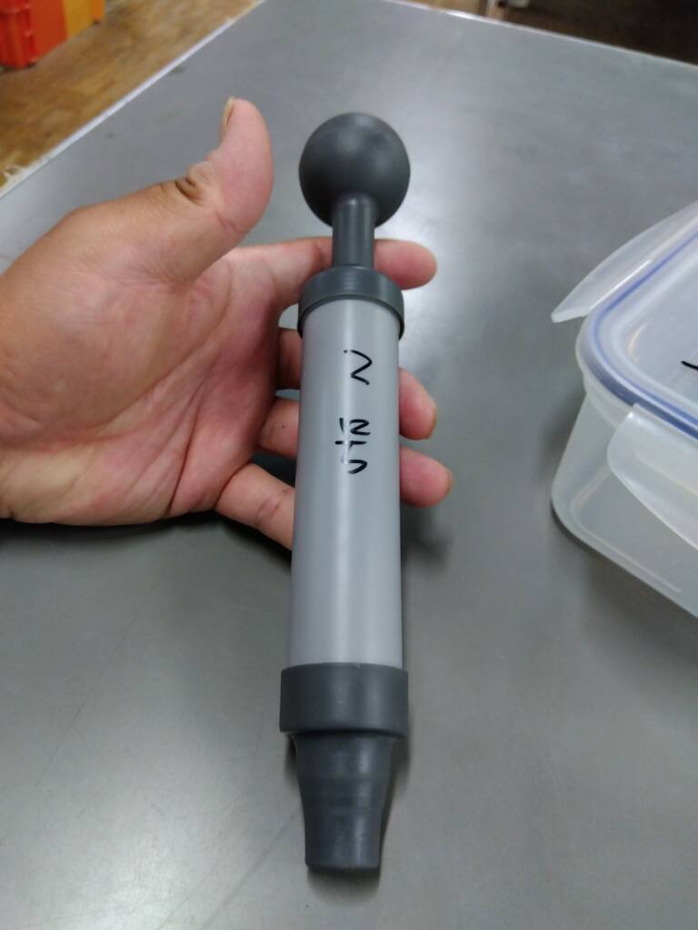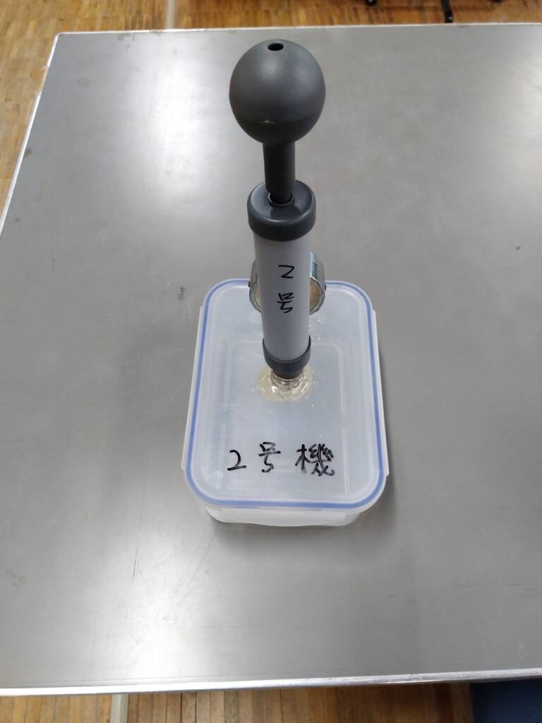 写真①のものは2号機です。1号機は別の事務所に行ったまま帰ってきません…。写真②が手動のポンプです。真空ポンプに相当する部品です。