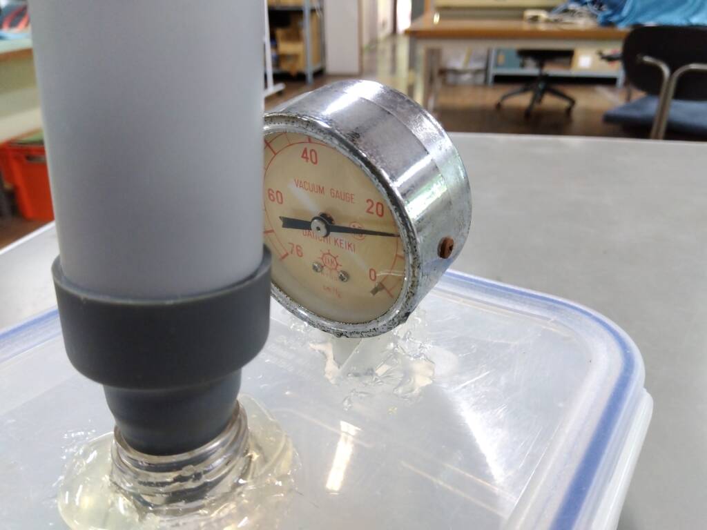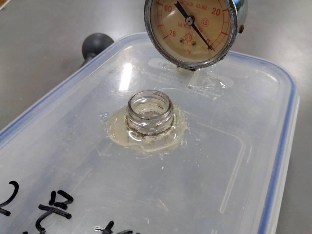 写真④は減圧作業中のようす。レバーをゆっくり引いていくと、容器の中の空気が吸い上げられ、減圧されていきます。デシケーター内の空気圧が下がるので、蓋が凹んでいきます。調子にのって減圧しすぎると蓋が割れるかもしれません。デシケーターがどれくらいの減圧に耐えられるのか分からないので、一度実験しないといけないのですが、愛着があるものを自ら破壊するのは嫌なものです…