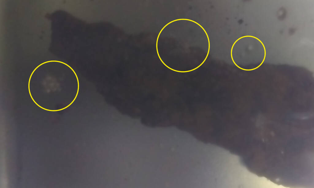 写真⑥と写真⑦は、デシケーター内のパラロイド溶液に浸された鉄製品の様子です。見づらいですが、写真⑥が減圧前の様子で、写真⑦が減圧中の様子です。写真⑦の〇印に注目してください。〇印の部分に、細かい気泡があります。この気泡は、減圧によって鉄製品中の空気が追い出されている様子です。空気が追い出されたところには、代わりにパラロイド溶液が入っていきます。ペタペタ塗ったり、一晩浸しておくのよりは、はるかに効果的です。