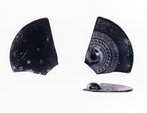 ここで紹介する鏡は、古墳でみつかった鏡でもなく、三角縁神獣鏡でもありません。そのうえ完全な形ではない、破片の鏡です。この鏡がみつかったのは、古墳からではなく竪穴住居でみつかっています。一緒にみつかっている土器が布留式と呼ばれるものであることから、時期は古墳時代前期(約1700年前)と考えられます。この鏡は、直径3分の1程度の破片で、扇形をしています。復元した直径は5.4㎝で、扇の要にあたる部分に鏡の鈕(ちゅう:鏡の背面の中心にある突起状のもので、孔があけられた紐を通す部分)が残っています。色合いは、作られた当時は、赤銅色だったと考えられますが、みつかったときは、緑青色でした。ただし、破片ではあるものの、残りは非常によく、鏡の表面はつるつるで、割れ目も非常に滑らかでした。鏡の文様は、いたってシンプルで、鈕の外側に2重の線が、その外側には珠文(しゅもん)と櫛歯文が巡っています。