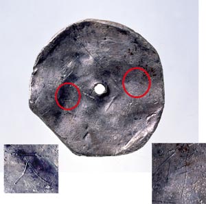 尼子西遺跡出土無文銀銭 (赤丸部分を下部に拡大)
