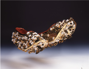 次に、履の底まで「飾りもの」がぶら下がっています。よく見れば魚の形をしています。これは「魚形歩揺(ほよう)」といい、冠などにもぶら下げて、「ゆらゆら揺れる」ことを目的にした仕組みです。女子高生の携帯ストラップ級で、「派手さ」は満点ですが、これを履の底に付けるとは、普通に歩くことを考えていない証拠です。