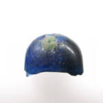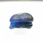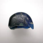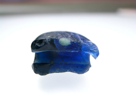作業員さんの1人が泥の中でキラッと光る半球形のものを見つけたのです。泥を落としてきれいにしてみると、群青色に輝いています。初めはよくわからなかったのですが、写真を撮影し、取り上げて間近で見てみると、どうやらガラスのようです。このガラス製品は厚さ約1.2㎝、短径2.6㎝・長径3.4㎝ほどの楕円形のものだったと思われますが、紐を通す穴が穿たれている部分で、半分に折れて欠損しています。全体は群青色のきれいなガラスなのですが、丸くなった先端部の裏と表には、直径6㎜ほどの緑青色の別のガラスが円形に鋳込まれています。この鋳込まれたガラスは、片方が鋳込まれたままの丸く盛り上がった状態なのですが、もう一方は鋳込まれたガラスの表面を磨き取って平滑に仕上げています。一緒に出てきた土器から、このガラス製品は6世紀中頃の古墳時代のものと思われますが、一体どういうものなのでしょうか。