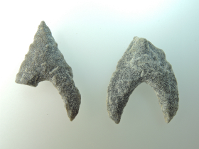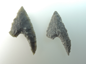 石鏃とは、弓矢の矢の先端に装着されるもので、先端にもかかわらず「矢尻(鏃:やじり)」(※)と呼ばれています。考古学では材質もあわせて説明するため、石で作られた矢尻は「石鏃」と呼びます。発掘調査では木質の弓・矢柄などが残ることは稀で、石鏃(銅鏃・鉄鏃等もあります)だけが出土することが大半です。