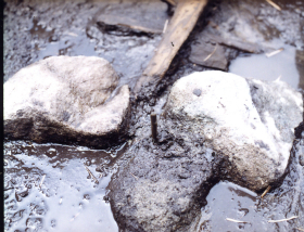 平成12~13年度に実施した発掘調査では、琵琶湖最大の内湖であった旧大中の湖の湖岸にあたる部分から、7世紀頃の突堤(とってい)状遺構がみつかっています。この突堤状遺構は、両側に杭を打ち込んで囲った中に、近くの安土山山麓から運んだ石材(湖東流紋岩)を詰め込んで造られていました。全長27m・幅3mのものを第1遺構とし、これよりも後の時代に造られた全長42m・幅2mのものを第2遺構と呼んでいます。その性格については、桟橋や消波堤など諸説がありますが、いずれにしろ古代の水運に関わる施設であったようです。