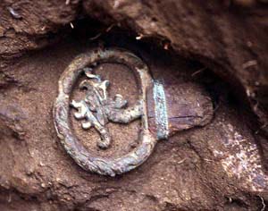 環頭部分は銅を主体とする合金のため錆化が著しく、表面を飾る金の残存状況は良くありません。材質分析では水銀が検出されていますが、これは表面の金が水銀アマルガムによる鍍金か、あるいは薄い金箔を水銀により貼り付ける方法がとられたことを示しています。環頭を詳細に観察すると、鱗を表現する円形工具の痕跡がくっきりと明瞭であること、外環基部(大刀の柄側)の金が徐々に薄くなることから、金箔を貼ったものではなく、水銀アマルガム法で鍍金したものでしょう。水銀アマルガム法とは、水銀に金を溶かした溶剤を表面に塗ったのち、加熱して水銀を蒸発させて金だけを残す方法です。この方法が日本にもたらされた時期は定かではありませんが、この環頭が製作された当時、日本にはこの技法が未だ導入されていなかったとすれば、製作地は朝鮮半島(百済か?)ということになります。