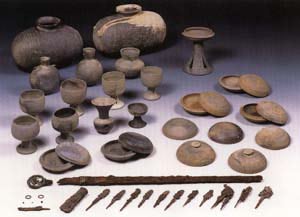 平成12年度に高島市マキノ町の北牧野古墳群で、2基の古墳を調査しました。調査の対象となった2基は、直径14~15m、高さ2mの円墳で、6世紀後半頃のほぼ同じ時期に、ほとんど接して築かれています。埋葬主体部は、ともに南の方向に入り口が開く横穴式石室です。そのうちの2号墳と呼んでいる1基は未盗掘で、環頭大刀(かんとうたち)が出土するなど副葬品が良好な状態で出土しました。