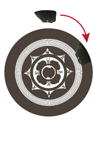 十里遺跡の破鏡は、5.0cm×2.8cmで厚さ0.4cmの大きさです。鏡の外区(縁の部分)の破片です。手に持ってみると冷たくてずっしりと重く、磨かれた表面は見事な光沢です。大切に使われていたことが伺えます。この破片から、鏡の全体像が復元されています。後漢の時代(紀元1世紀頃)に中国で作られた内行花文鏡と考えられています。加工された場所は不明ですが、はるばる滋賀まで運ばれてきたことになります。