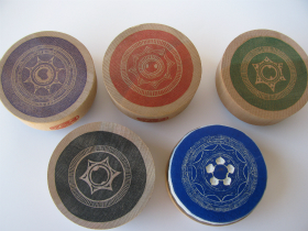 ハンコを作った後に内行花文鏡に興味が湧き、滋賀県出土の資料を探してみたところ、県内からは12面が出土していました。一番大きなものは、雪野山古墳(東近江市)から出土した直径24cmで、一番小さなものは、山津照神社古墳(米原市)から出土した直径7.1cmです。ほとんどが中国で生まれた内行花文鏡を真似て、日本で作られたと考えられています。このような鏡を「仿製鏡(ぼうせいきょう)」といいます。「仿」には「ならう」という意味があります。趣味が高じてそのうちいくつかをハンコにしてみました。基本的な構図は同じですが、バラエティーに富んでいることがわかりました。鏡を作った匠のアレンジ・センスのすばらしさが窺えます。