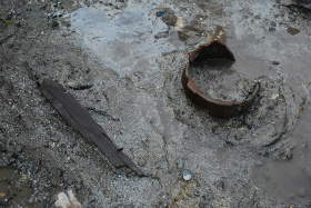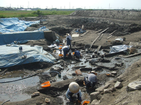 湖西地域北部の高島市に所在する上御殿遺跡では、平成24年度に行った発掘調査において、同じ人名が7行も書かれた珍しい墨書土器が奈良時代の川から出土しました。川の底に堆積した砂を徐々に掘り進めていくと、口の部分を上に向け、その場所に置かれたような状態で見つかりました。周辺からは、自分についた穢れを移し祓うのに使用される人形代(ひとかたしろ)といった木製祭祀具が出土していることから、これらとともに祭祀に使用されたと考えられます。