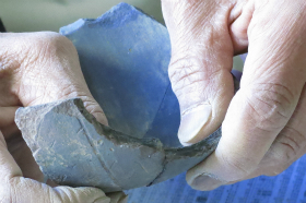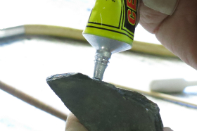 セメダインCを土器片の割れ面に薄く塗り(指で断面に均一に塗るのが技です)、少し乾かしてギュッと合わせ、暫くするときっちりくっついてくれます。くっつけた後「ゆがんだかな?」「失敗したかな?」と思っても心配無用。アセトンと言う薬品を少し染ませてあげると簡単に元に戻すことが出来ます。強すぎず、弱すぎず、やり直しもきく。まさに土器の接合作業にピッタシの接着剤です。発掘業界では「接合する」=「くっつける」=「セメダイン」で意味が通じます。例えば、土器が壊れてしまったときなど「セメダインではっといたらええやんか」とかるーく言ってしまいます。