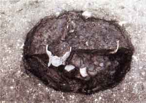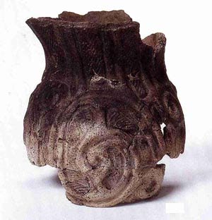 こうして、翌年、念願の内湖底にある縄文時代遺跡の発掘調査をすることになりました。しかし、広い面で掘ってみますと、試掘調査ではわからなかった、地面に掘り込まれた4つの穴が見つかりました。これらは、調査が進むにつれ、さらに古い縄文時代中期末の木の実を貯蔵する穴だとわかりました。ですが、貯蔵していた木の実は取り出されて無く、なかには縄文土器や石器、ニホンジカの骨、木片などが投げ込まれていました(写真1)。縄文土器は、残りのいいものが数多くありましたが、私が今回紹介する逸品は写真2の土器です。球状の胴部にラッパ形に開く頚部がつながる器形ですが、残念ながら上(口縁部)と下(底部)はなくなっていました。外側には隆帯と沈線で囲んだ磨消縄文帯で文様を描き、内面のナデ整形も丁寧で、この滋賀県ではほとんど見かけない特徴をもっています。