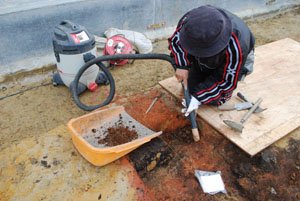 このようなときに威力を発揮するのが電気掃除機です。狭くて手や道具が入らないような細かいところでも土や砂の取り残しがなく驚くほど美しく仕上がります。最大の工夫は吸い込み口の口径をガムテープなどで調整することです。吸引力の調整もできますし、防水型掃除機を使えば泥水も吸いとることができます。たまに土器片などが土といっしょに吸い込まれたりして、あわてることもありますが・・・。