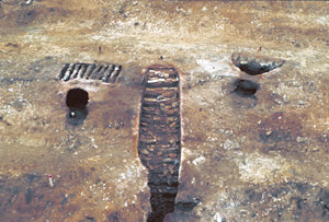 蓮華文方形軒瓦は、南滋賀町廃寺から西方約200mにある「榿木原遺跡」(はんのきはらいせき)の登窯で焼成されていました。榿木原遺跡は、白鳳時代から奈良時代・平安時代に南滋賀町廃寺に葺く瓦を製作していた工房跡で、登窯・平窯の瓦窯や粘土貯め施設、作業建物などが見つかっています。現地では、白鳳時代の登窯が移転保存され見学することができます。瓦当の大きさは縦21㎝、横23㎝で、肉厚な蓮弁を左右に四葉ずつ配し、中央の中房(ちゅうぼう)は花弁を三段に表現し、最上段には輪郭が付きます。花弁には珠文(しゅもん)が付くものと付かないものの2種類があります。外縁は幅が広めで文様はありません。また、通常の軒丸瓦は、後ろに延びる部分が丸く半円形になり、ゆるいカーブを描く2枚の平瓦が接する部分に被せるのに対し、蓮華文方形軒瓦の後ろに延びる部分が逆凹状になっており、セットになる平瓦もそれに合うように四角く凹状に造られています。方形平瓦は穴太廃寺からも出土していますが、蓮華文方形軒瓦は出土していません。この蓮華文方形軒瓦は、複弁蓮華文軒丸瓦のようなシャープさがないところに魅力と味わいがあります。