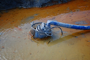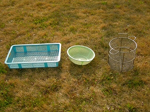 そこで、この労力を省くためにカゴが登場するのです。葉っぱや小枝・ドングリが直接ポンプに寄りつかないようにカゴの中にポンプを入れて使うのです。すると、カゴの目のまわりには植物は付きますが、ポンプまでは達しないため、詰まらずに水を抜き続けてくれます。ただ、カゴといってもさまざまなタイプのものがあります。浅めのカゴ、調理に使うザル、時には自転車の前カゴを転用することも。どれも一長一短があります。私がこれまでに用いたカゴのなかで最も良かったのは、ウォーターセパレーションのカゴです。ウォーターセパレーションとは、土壌を水洗して炭化物や種子などの微細な遺物を採取する道具ですが、これに用いるメッシュカゴです。深みもあり、カゴの編み目の大きさもほどよく、何よりもステンレス製で丈夫です。昨年行った発掘調査では、台風にともなう大雨で調査地の壁が一部崩壊し、水中ポンプとともに埋まってしまいましたが、ゆがみはしたものの大丈夫でした。このメッシュカゴのおかげで、その調査もなんとか無事終えることができました。ただ、できれば水の湧かない場所で調査をしたいものです。