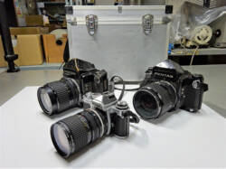 私の職場(公益財団法人滋賀県文化財保護協会)では、これまで6×7ブロニー版フィルムカメラでモノクロフィルムとカラーリバーサルフィルム、35mmフィルムカメラでカラーネガフィルム(写真1)、そして補助的にデジタルカメラ(APS-C)の合計4台のカメラで記録写真の撮影していました。既に広く普及しているデジカメを「補助的」としているのは、保存対象となる写真の保管の永続性という観点から、今後記録媒体がどのように変化していくかが不透明であるといったデータの保存・保管方法などに課題があったため、あくまで重視されるのはフィルムカメラの写真でした。