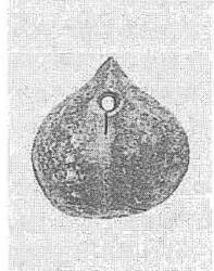 滋賀県南部の大津市に所在する粟津湖底遺跡第3貝塚(縄文時時代中期前半/調査員のおすすめの逸品第288回参照)からは、3点のヒメグルミ核(殻)のペンダントがみつかりました(写真1~3)。大きさは長さ25~27㎜、幅18~23㎜、厚さ9~10㎜、いずれも縫合線(合わせ目)を境に半分に割れていて、頂部から4~6㎜下がったところに直径1~5㎜の円形の穴をあけています。穴の周囲には同心円状の擦痕がみられ、穴をあけかけてやめた痕のあるものもあります。また縫合線上に核をこじあけて割ったと考えられる痕跡も認められました。