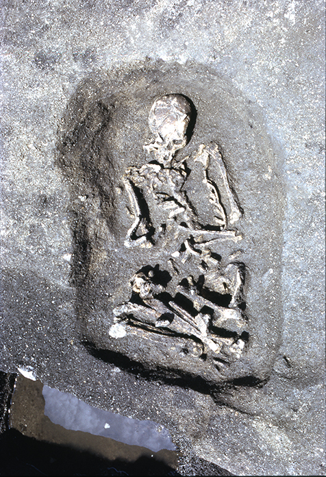 酸性土壌のため、日本の本州では骨など有機質のものが土の中で溶けてしまい、今日まで残っていることは稀です。しかし、この遺跡では偶然にも骨が保存されやすい条件が整っていたため、お墓だけでなく、その中に眠る人骨も一緒に見つかったことは注目に値します。発見された埋葬人骨の数は、滋賀県内の縄文遺跡において最多数を誇ります。