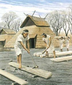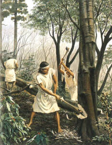 図1 太型蛤刃石斧を使った樹木の伐採(安土城考古博物館常設展示図録より転載)