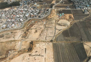 守山市西南部に位置する横江(よこえ)遺跡(守山市横江)からは、北に境川(さかいがわ)、南に海道(かいどう)川が流れる川に挟まれた中州上に造られた村の跡が見つかっています。滋賀県文化財保護協会が、昭和58年度から昭和62年度まで5年間にわたり発掘調査を行いました。平安時代後期(11世紀末)〜室町時代前期頃(14世紀)まで長期間続いた村をまるごと発見できたことから、発見当時はたいへん注目を集めたようです。