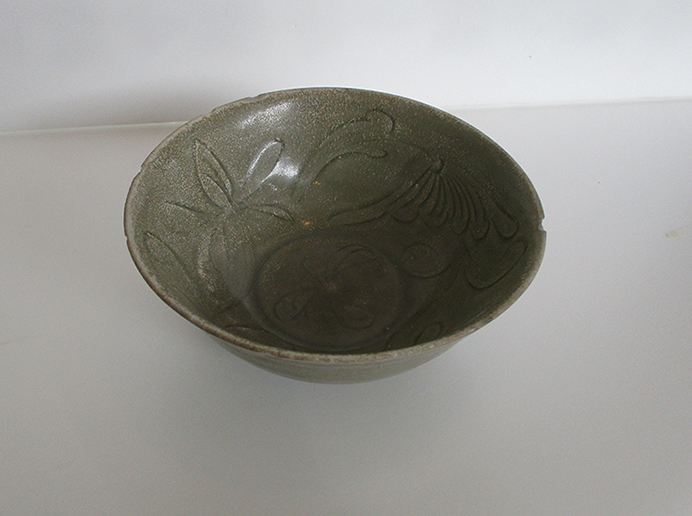 村の中央部には、土壇状に土を盛り上げている一辺約40m四方の屋敷地が見られました。屋敷地の中から、白磁の香炉(こうろ)・水滴(すいてき)・仏花瓶(ぶっかへい:仏壇に花を供えるための花瓶)、青磁の合子(ごうす:蓋のついた容器)など、当時としては高級品であったと考えられる品々が数多く見つかったことから、村の中心的な役割を果たしていた有力者が住んでいたと考えられています。写真2の青磁碗は、この屋敷地内から出土したもので、12世紀中頃~後半頃に、中国の浙江(せっこう)省の窯で焼かれました。釉薬の色は、光沢のある透明度の高い淡い青緑色で、胎土(焼物の原材料の土)は少し灰色に近い白色です。内面には、豊かさと子孫繁栄を象徴する吉祥文である蓮が小刀で描かれています。中国で焼かれた青磁は、この青磁が焼かれた頃の宋代(960~1279)のものが最高の品質であるとされています。