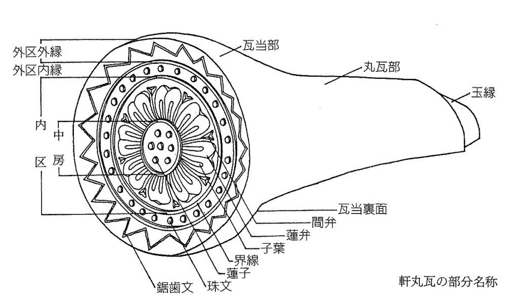 今回ご紹介するのは昭和49年2月から4月まで行われた調査で出土した複弁蓮華文軒丸瓦(ふくべんれんげもんのきまるがわら)―報告書中ではⅠA01型式―です。いわゆる川原寺(かわらでら)式軒丸瓦で、瓦当面(がとうめん)は、幅の狭い互い違いのノコギリの歯のような外縁(面違鋸歯文・めんたがいきょしもん)をもち、一枚の蓮弁(れんべん)に子葉(しよう)が2つある複弁蓮華文で、子葉の間を通る花弁中軸の隆起が明瞭に表れています。間弁(かんべん)はY字状を呈し、中房(ちゅうぼう)まで伸びています。中房には1+5+9で蓮子(れんじ)が配置され、外側2周の蓮子には圏線が施されています(写真1)。この瓦の年代観としては670~680年代が与えられています。