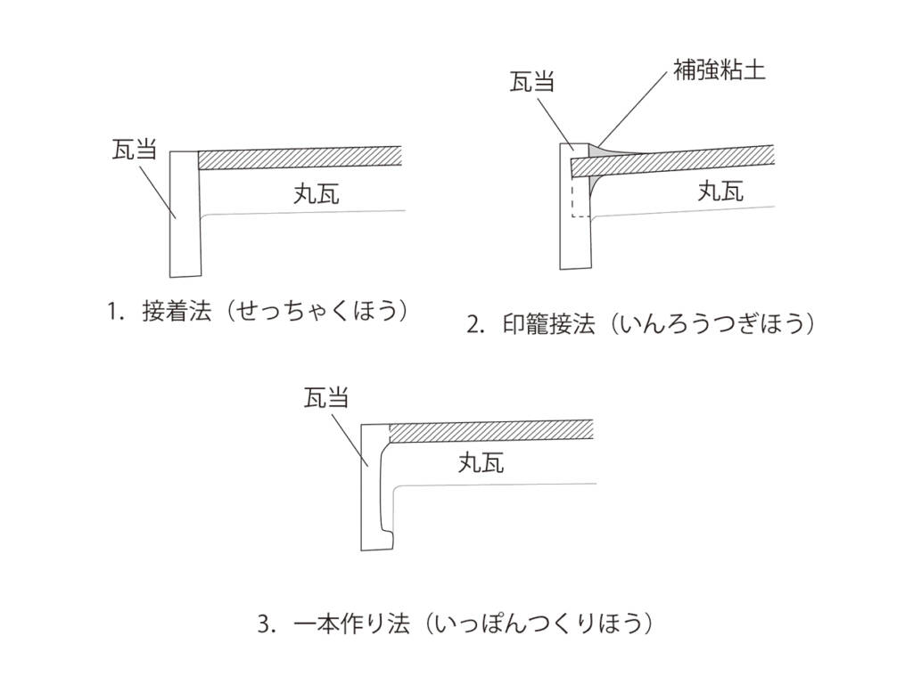 この瓦の珍しい点は瓦当の裏面と側面にあります(写真2・3)。瓦当裏面は絞った布の痕跡が残り、その周縁部が一段高くなっています。また側面には叩きしめた痕跡が残っています。これは「縦置型一本作り」という技法を用いて作られた瓦である痕跡となっています。通常、軒丸瓦は瓦笵(がはん)に粘土を詰め込んで、別に用意しておいた丸瓦を接着して作ります(「接着法」もしくは「印籠(いんろう)継法」・図2-1、2-2)。