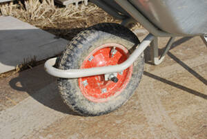 他人がこれを使っているのを見ると簡単そうに見えますが、実際やってみると左右にふらつき、使いこなすには多少の慣れが必要です。水を含んだ土を大量に積むと相当な重さになるので、一輪車での土運びは結構な重労働でもあります。加えて足元も悪いため、調査現場で使っていると、かなりの頻度でパンクします。タイヤの空気が抜けると、一輪車を押すときの抵抗がすさまじく増すので、タイヤはとても大事です。別売りなので付け替えて使いますが、最近は「ノーパンクタイヤ」なるものもあります。通常のタイヤはゴムチューブ式ですが、「ノーパンクタイヤ」はゴムの塊で形成されており、パンクすることはありません。かわりに少々柔らかいので、泥にめりこみやすく、現場の状況によっては向かないこともあります。