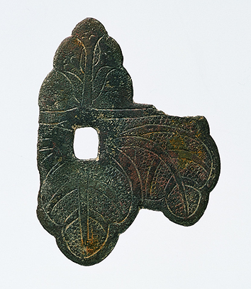 この桐紋金具(写真1・写真2)は、戦国時代の「磨石」と同じく、丘陵に刻まれた谷部にあった、上級家臣達の屋敷地を区画する堀の中から見つかりました。銅製の飾り金具で、残念ながら左側3 分の1 と右側の上端部を欠損しています。長さ5.1㎝・残存幅 3.7㎝・厚さ 0.2㎝・残存重量 9.4gを測り、中央には一辺0.6cmの隅丸方形の孔が穿たれています。用途としては、化粧箱などに取り付けた、紐飾りと考えられます。この桐紋は、五三桐(ごさんのきり:3枚の桐の葉の上に中央に5つの桐花を、その左右にそれぞれ3つの桐花を配した図柄)を意匠としています。花や葉は、蹴彫(けりぼり)で表現されていて、さらに葉は葉脈の部分が無地ですが、その間は魚々子(ななこ)で表現されています。この桐紋金具が、なぜ佐和山城の特徴をとてもよく表していると言えるかといいますと、桐紋は織田信長や豊臣秀吉などの権力者が好んで用いたからです。