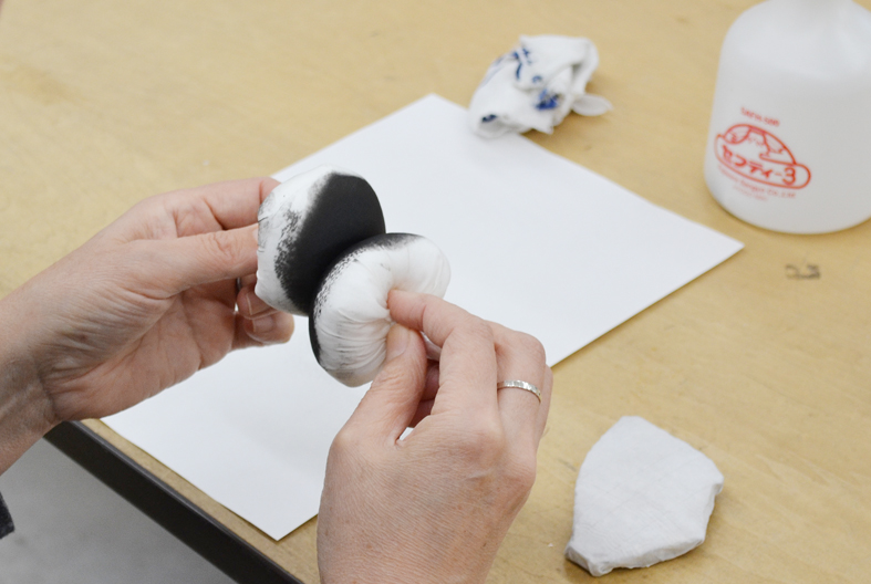 ➂ 画仙紙が少し乾くまでの間に、墨をつける用意をします。この時に使用する道具が、タンポです。タンポは綿を布で包んだもので、テープなどを巻き付けて持ち手となる部分を作っています。これをふたつ用意し、ひとつに墨をつけたのちにふたつをこすりつけてムラをなくします。拓本をとる部分によっては、小さなタンポを使用する場合もあります。なお、墨は油性拓本墨を使用しています。貼り付けた紙が多少湿っていてもにじまず、濃淡の調整が可能です。