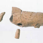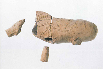 ちなみに六反田遺跡で出土している土馬は、ぼってとした農耕馬の方です(写真2)。円筒形の胴体に竹を押し当てた竹管文と半分に割った竹で描いた沈線文の組み合わせで馬具を表現し、頭部には目を竹管文で表現し、手綱を沈線文で描いています。特徴は胴部の大きさに比して足が短く、頭部が小さいので、全体に非常にアンバランスでちんちくりんな印象を受けます。