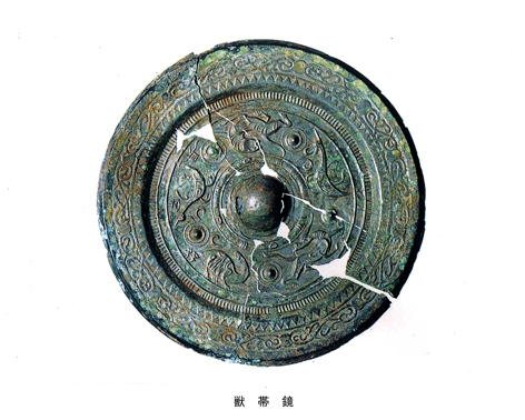 特徴や製品の精巧さからみて,中国からの輸入鏡(舶載鏡)とみられ,1世紀~2世紀に後漢で作られ,当地に持ち込まれたものと考えられます。北山古墳が造られた時期は,短甲などの出土遺物の年代観から5世紀代と考えられますから(調査員おすすめの逸品№131),鏡が作られた時期とは200年~300年の差があることになります。このことは子孫代々にわたって伝世された結果と考えられます。