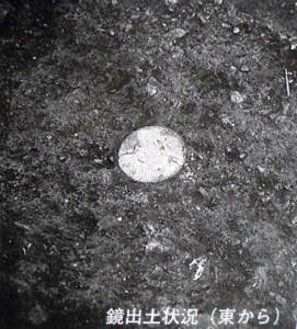 というやり取りを,寒くて薄暗い林の中で30分ほど繰り返して,なんとか撮影を終了しました(写真1)。その後,薄暗い中で鏡を取り上げたのですが,鏡というのは想像以上に薄く作られており,出土時から既に少しヒビがあったこともあって,残念ながら割れてしまいました。取り上げた鏡は速やかに保存処理技師に渡せたこともあって,全体が薄緑に錆びることは免れたのですが,残念ながら出土時の独特の輝きは失われました。
