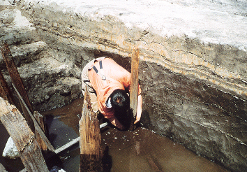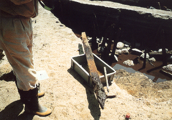 また、矢板杭の長さや、打ち込まれた深さを確認するため、サンプルとして遺構の中心部の矢板杭を1本引き抜いてみると(引き抜くのはかなり大変な作業でしたが)、引き抜いた杭は、長さ196.3㎝・幅9.4㎝・厚さ5㎝の大型の杭で、下から15㎝の部分を両側から削り込んで、先端を尖らせた、大型のものであることがわかりました。地盤が柔らかいため、長さの約半分の深さまで地中に打ち込こまれていました。