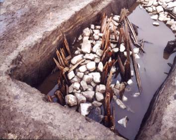 第2遺構は、長さ0.6~1.9m・幅10~15㎝の針葉樹の矢板杭を隙間なく打ち込んで側板とした内側に、安土山山麓から運ばれた30~50㎝の石材(湖東流紋岩)を詰め込んだ構造で造られていました。第2遺構の調査では、遺構が伸びる方向や範囲を調べるための部分的な発掘調査であったため、全長の半分の面積のみを検出しています。発掘調査では、157本の矢板杭を確認できましたので、掘り下げていない部分にも杭が打たれていると考えると、300本以上の矢板杭が使われていたと考えられます。