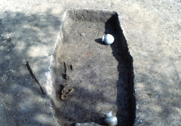 この時の調査で悔やまれることが2つあります。写真をみると徳利形平底壺の口の部分が少し欠けているのがわかると思います。調査の時、表土を重機で剥いでいたときにやってしまいました。いい訳すると、表土のすぐ下が遺構面であったことや、徳利形平底壺の口の部分が土坑墓の埋土ぎりぎりにあったことで「カリッ」といってしまいました。もう1つは須恵器の甕です。これまた写真をみると、細い穴が空いていて周りも割れています。この土坑墓を掘るときに土が硬かったので、最初にバチ鍬という道具を使いました。その一投目、「カチン」という音とともに甕の体部の一部が割れて空洞であった中に落ちました。その後、写真撮影にあたってくっつけてみましたが、バチ鍬の当たった部分だけは元に戻りませんでした。調査から20年以上たった今でも忘れない痛恨の思い出です。