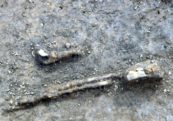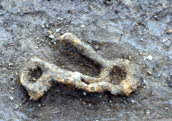 話がそれたので戻します。今回紹介する徳利形平底壺は、土坑墓(どこうぼ)から出土しました。土坑墓とは、たんに地面を掘っただけの墓で、墓としてはもっとも簡単なものです。木棺の痕跡が残っていまいかと埋土の観察も行ったのですがまったくみられませんでした。単に坑(あな)を掘って埋葬しただけのものだったみたいです。こんな簡単なお墓のわりには、どうしてどうして「イイモノ」がでてきました。徳利形平底壺以外に須恵器の甕1点、鉄鏃5点、轡(くつわ)1点です。轡というのは馬具の一種で、馬の口にはませその両側に手綱(たづな)をつける鉄製の道具です。馬を制御するために用いるため、乗馬するのにあたりもっとも基本的な道具になります。金ピカ品こそ出ませんでしたが、その辺の古墳にも見劣りしないような品を副葬したお墓だったのです。