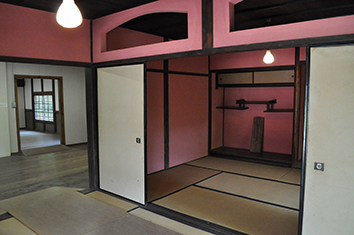 では旧柳原学校校舎を外観からみてみましょう。建物は2階建、その上層に時報のために太鼓をつるした塔屋をもちます。2階には、バルコニー部分があり、手すりや建具の意匠などに洋風を取り入れています。正面左には、アーチ形をした入り口があります。ここから、建物の中にはいってみます。1階部分には、板の間の空間と畳の和室が3間あります。板の間は、教室や雨天遊技場として使われていたようです。2階と塔屋部分は現在公開してはおりませんが、2階には和室が2間、さらに階段を登ると太鼓のつるされた塔屋にたどり着きます。一通り御覧いただくと、お気づきかと思うのですが、洋風建築とはいえ、和室もあるなど、ところどころに和風の要素が…。これは、神社の社務所建築をベースに古材を活用したためであると言われています。そういう目で、もう一度外観を見てみると、正面右の玄関は妻飾りに木連格子をつけた入母屋造り。神社の社務所であっただろう部分をそのまま用いているところも。